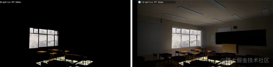 如下是两张对比图,左侧是直接光渲染,右侧开启动态漫反射全局光照,来增加间接光效果。