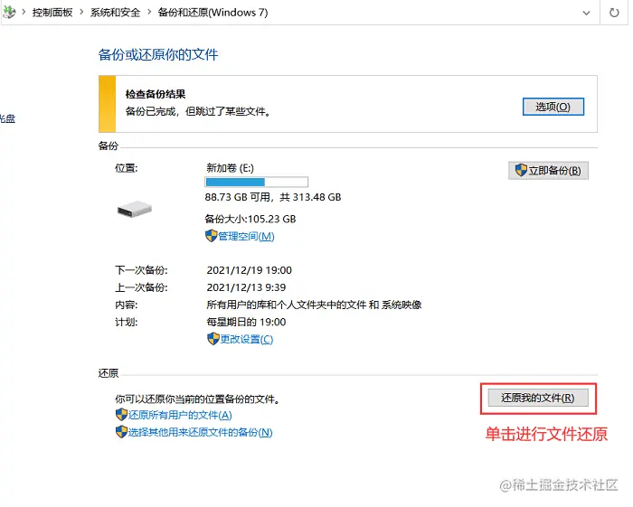 步骤二:在备份与还原界面单击【还原我的文件】。
