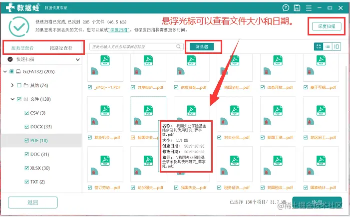 在扫描窗口的左侧可以按照类型和路径查看通过快速扫描恢复的文件,将鼠标悬浮在文件上方就可以查看文件的具体信息了。完成文件的查看之后,找到了目标文件,勾选文件名称前面的复选框,就可以进行文件恢复了。