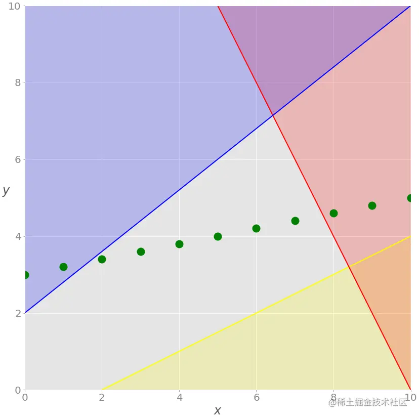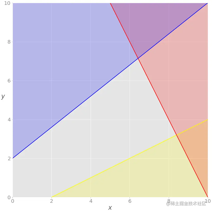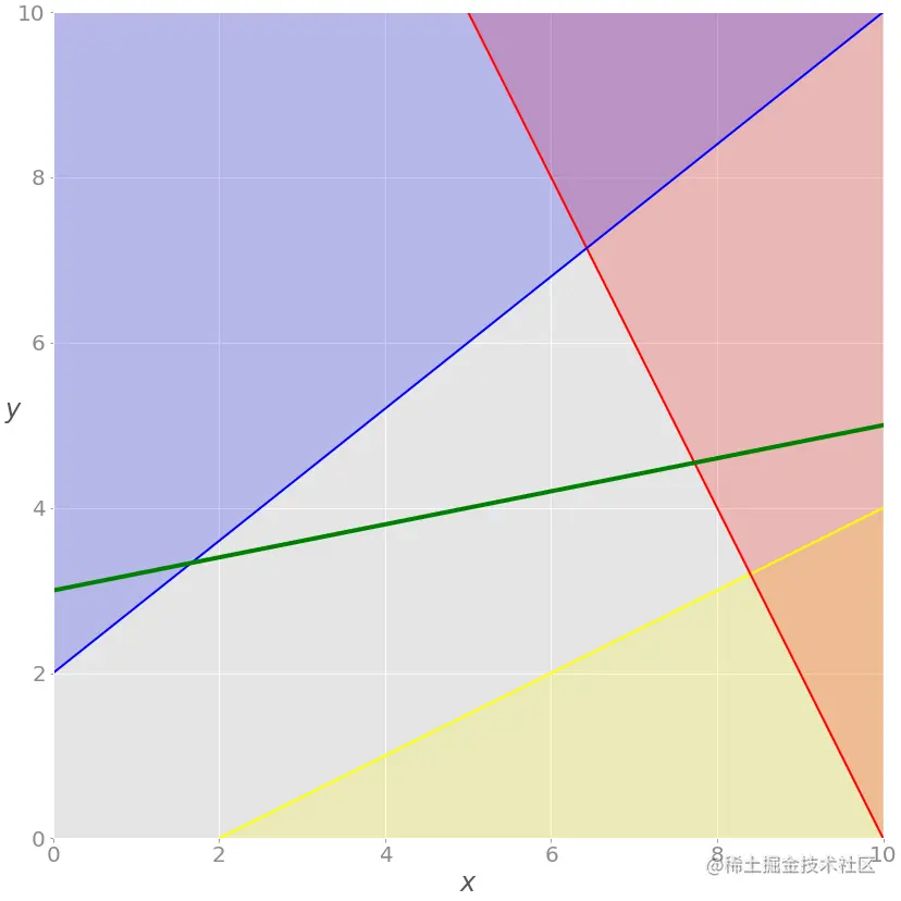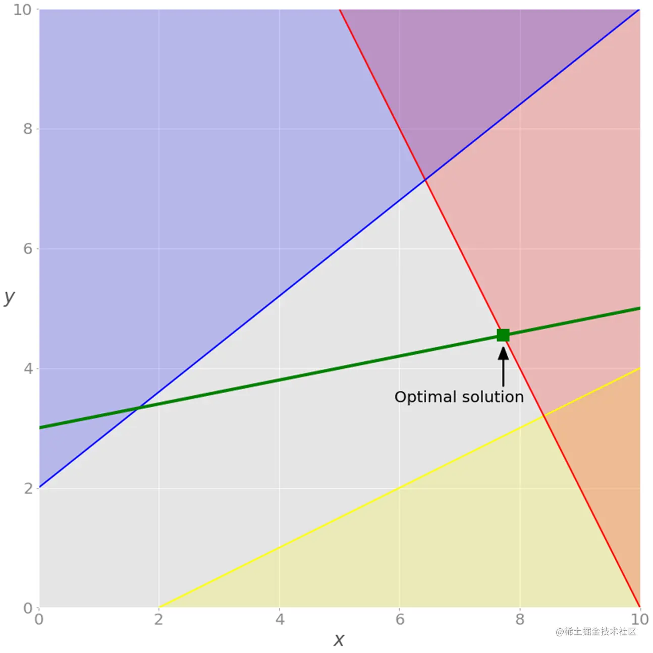 如果您忽略红色、蓝色和黄色区域,则仅保留灰色区域。灰色区域的每个点都满足所有约束,是问题的潜在解决方案。该区域称为可行域,其点为可行解。在这种情况下,有无数可行的解决方案。