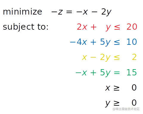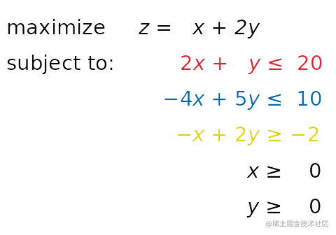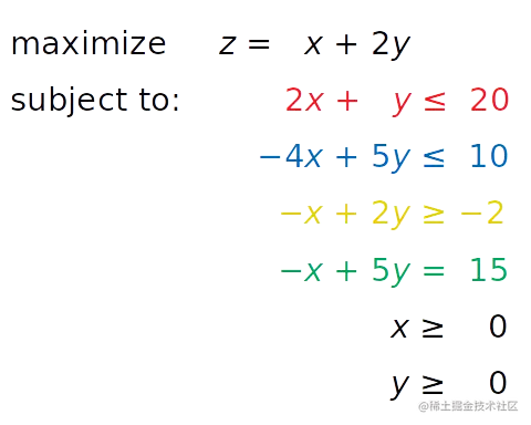 您需要找到的自变量(在本例中为x和y)称为决策变量。要最大化或最小化的决策变量的函数(在本例中为z)称为目标函数、成本函数或仅称为目标。您需要满足的不等式称为不等式约束。您还可以在称为等式约束的约束中使用方程。