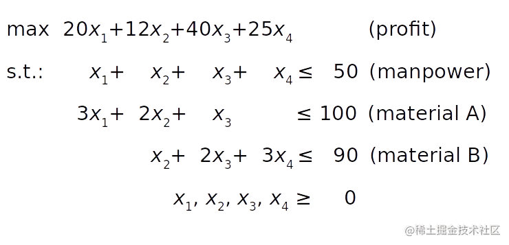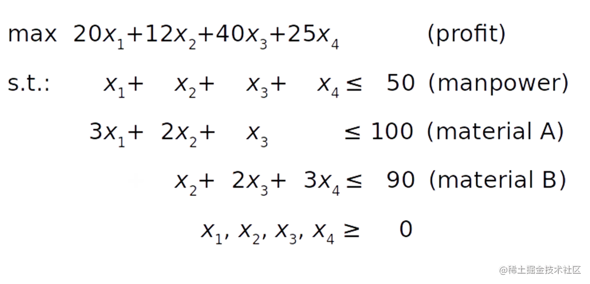 目标函数(利润)在条件 1 中定义。人力约束遵循条件 2。对原材料 A 和 B 的约束可以从条件 3 和条件 4 中通过对每种产品的原材料需求求和得出。
