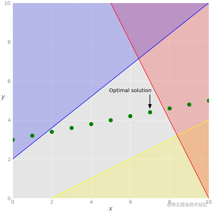 如您所见,最佳解决方案是灰色背景上最右边的绿点。这是两者的最大价值的可行的解决方案x和y,给它的最大目标函数值。