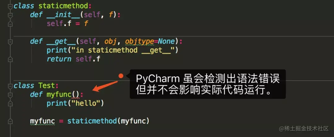 由上面的注释,可以看出 staticmethod 其实就相当于一个描述符类,而myfunc 在此刻变成了一个描述符。关于 staticmethod 的实现,你可以参照下面这段我自己写的代码,加以理解。