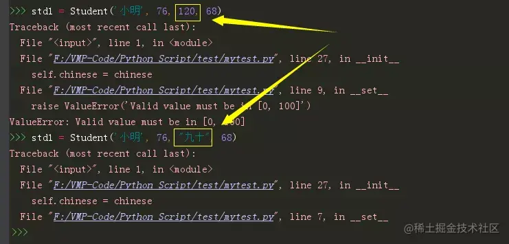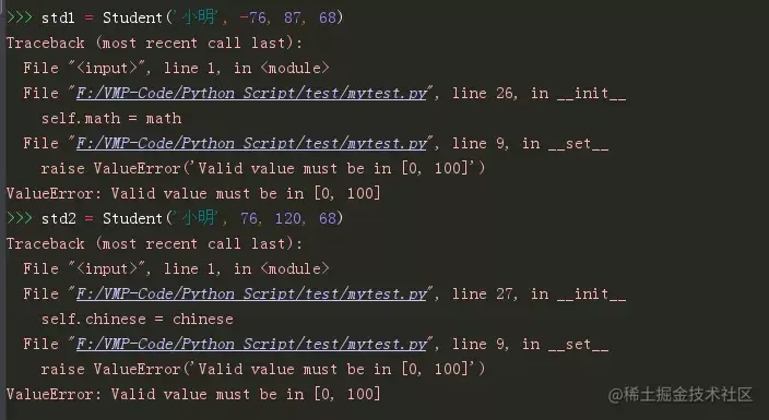 如前所述,Score 类是一个描述符,当从 Student 的实例访问 math、chinese、english这三个属性的时候,都会经过 Score 类里的三个特殊的方法。这里的 Score 避免了 使用Property 出现大量的代码无法复用的尴尬。