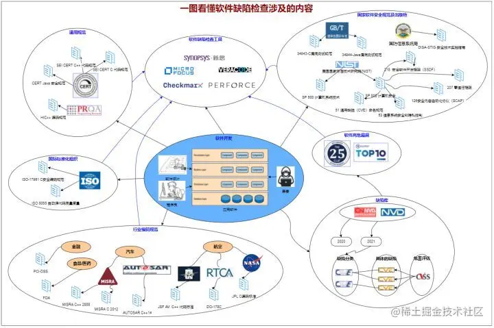这个图更多的是从如何减少软件缺陷出发,展示了业界发布的各种编码规范中的一部分,这些规范都是静态检查工具在检查的过程中需要完成覆盖的;