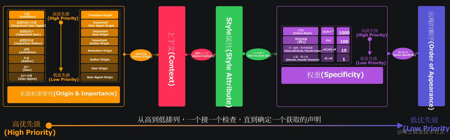过滤来自不同源的css规则后,确定同源优先级高低,决定谁“优胜”