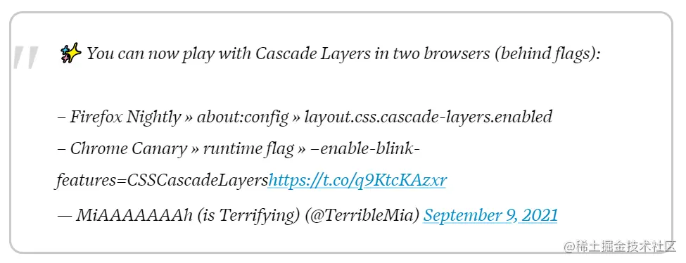 会发现这条信息里面出现了一个CSS的新名词CSS Cascade Layers,出于好奇以及对新知识的渴望(说得我自己都信了,哈哈),于是查阅起CSS Cascade Layers的相关资料,试图搞懂它。