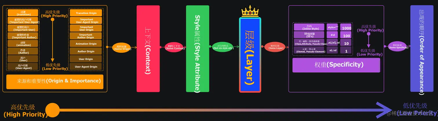 可以看出CSS的级联层一般位于“Style 属性”(Style Attribute)和 CSS 选择器权重(Specificity)之间。