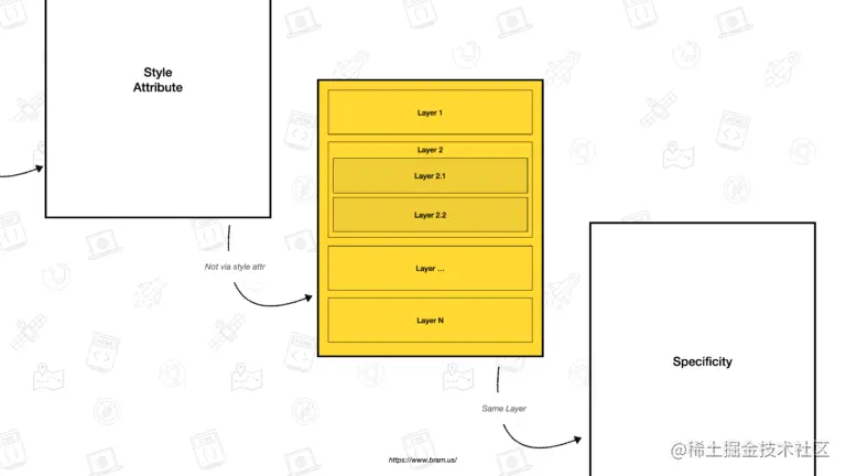 随着 Cascade Layers 的出现,我们的开发人员将拥有更多的工具来控制 Cascade。Cascade Layers 的真正力量来自它在 Cascade 中的独特位置:Style 属性(Style Attribute)和 CSS 选择器权重(Specificity)之间。因此,我们不需要担心其他层中使用的 CSS 的选择器特异性,也不需要担心我们将 CSS 加载到这些层中的顺序.