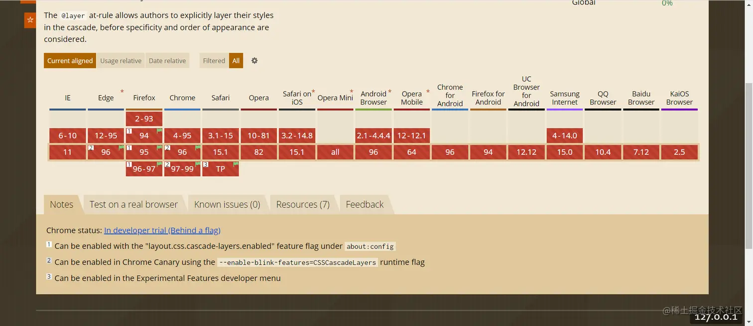 了解到这里,是不是觉得@layer相当地cool,迫不及待地想去使用了,我们看一下caniuse @layer的兼容情况,