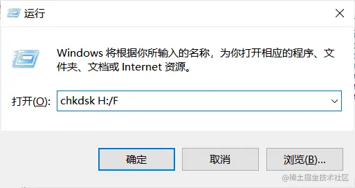 步骤二:输入【chkdsk H:/F】,H是指TF卡在本机中的盘符,F是修复参数,按下enter键确认,等待修复即可。