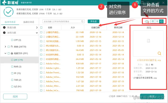 步骤二:在软件扫描过程中,扫描进度下方的文本框右侧,可以对文件进行预览,查看文件的路径、大小、日期等信息,单击文本框中间的指标,可以对文件依据不同的指标进行排序,提高检索文件的效率。在左侧可以查看通过快速扫描和深度扫描两种模式检索出来的文件。