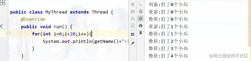 System.out.println(Thread.currentThread().getName()+"打了:"+i+"个小兵");