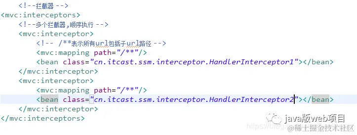 a.针对HandlerMapping配置(不推荐):springmvc拦截器针对HandlerMapping进行拦截设置,如果在某个HandlerMapping中配置拦截,经过该HandlerMapping映射成功的handler最终使用该拦截器。(一般不推荐使用)
