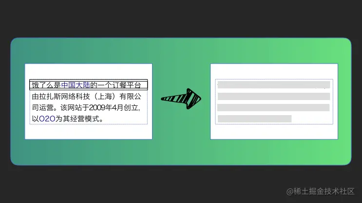 文本块可以算是骨架屏生成中最复杂的一个区块了,正如上面也说的,任何只包含文本节点的元素都将视为文本块,在确定某个元素是文本块后,下一步就是通过一些 CSS 样式,以及元素的增减将其修改为骨架样式。