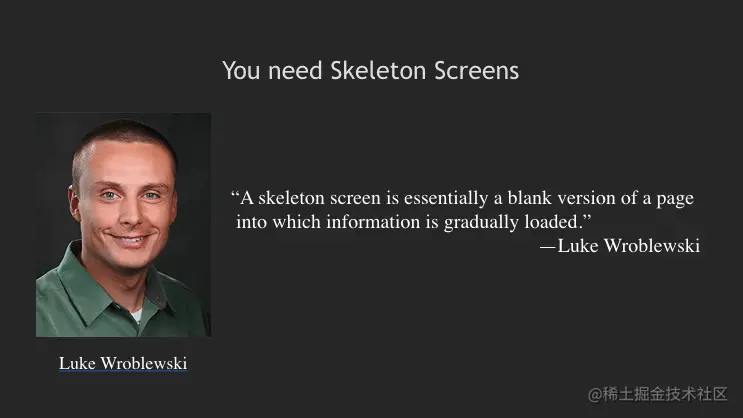 其实,骨架屏(Skeleton Screen)已经不是什么新奇的概念了,Luke Wroblewski 早在 2013 年就首次提出了骨架屏的概念,并将这一概念成功得运用到他当时的产品「Polar app」中,2014 年,「Polar」加入 Google,Luke Wroblewski 本人也成为了Google 的一位产品总监。