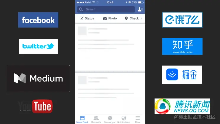 随后,Twitter,Medium,YouTube 也都在其产品设计中添加了骨架屏,骨架屏一时成为了首屏加载的新趋势,国内一些公司也紧随其后,饿了么、知乎、掘金、腾讯新闻等也都在其 PC 端或者移动端加入了骨架屏设计。