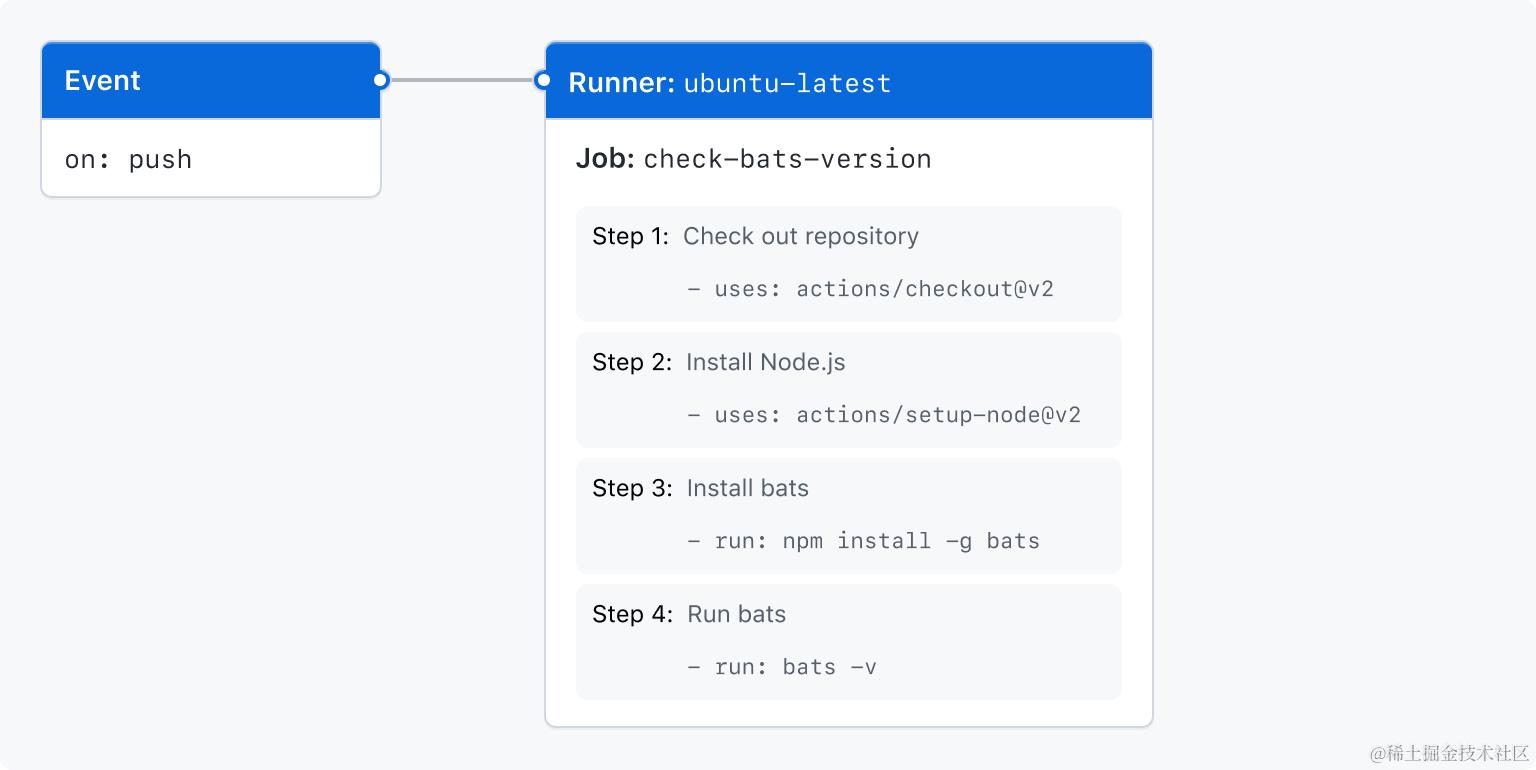 现在我们在代码仓库创建一个示例工作流,当代码被推送的时候,会自动执行一系列的命令。在这个示例工作流中,GitHub Actions 会检出提交的代码,安装依赖,运行 bats -v: