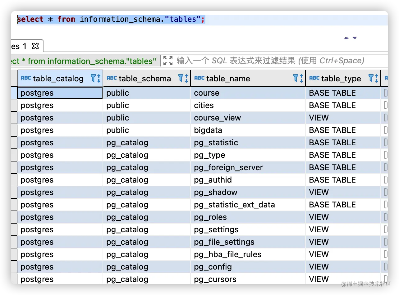 PostgreSQL 除了默认的 public schema 之外,还有两个比较重的系统 schema:information_schema 与pg_catalog。