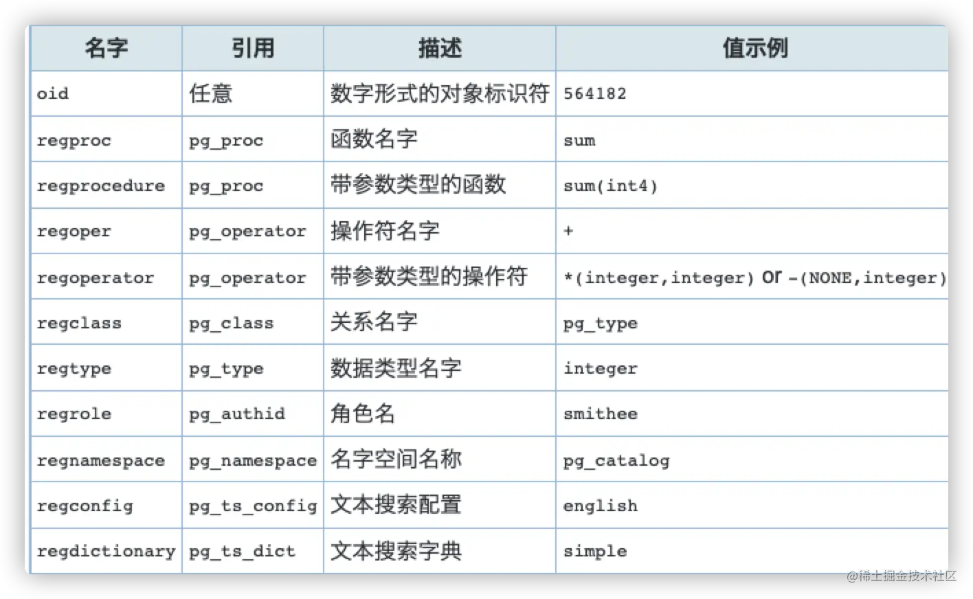 类型oid表示一个对象标识符。 也有多个oid的别名类型:regproc,regprocedure, regoper, regoperator,regclass, regtype, regrole,regnamespace, regconfig, 和regdictionary。