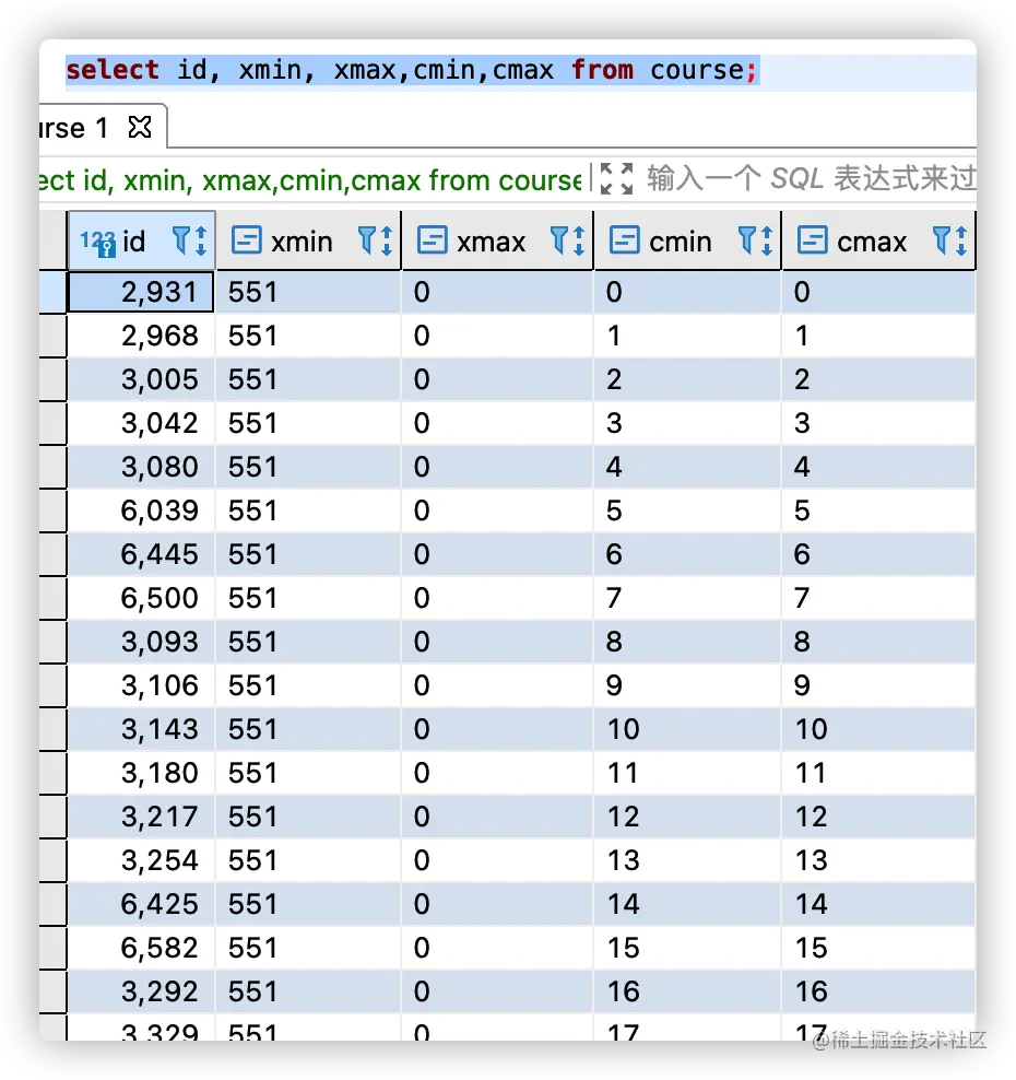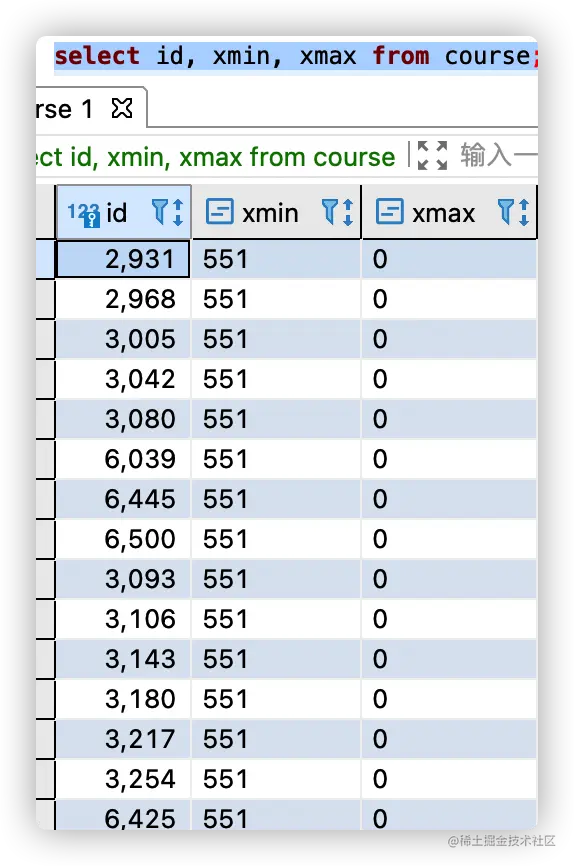 select id, xmin, xmax from course;