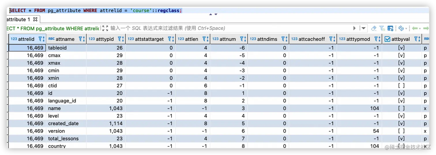 SELECT * FROM pg_attribute WHERE attrelid = 'course'::regclass;
