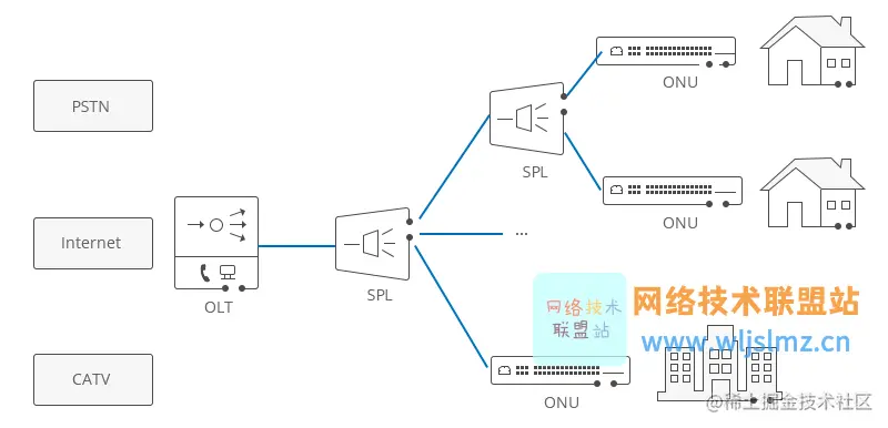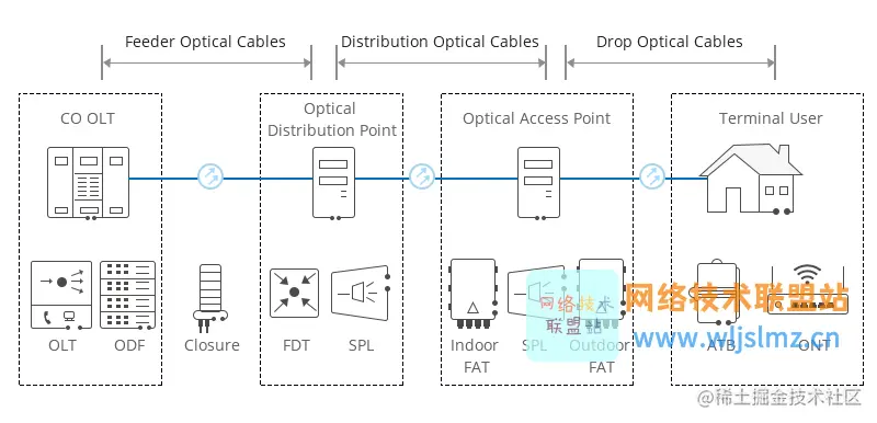 通常,ONU 和最终用户的住所之间有一段距离或其他接入网络,此外,ONU 可以发送、聚合和整理来自客户的不同类型的数据,并将其向上发送到 OLT。