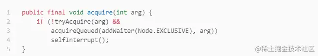 如果tryAcquire没有被重写,程序根本执行不到方法acquireQueued。因为不会有线程拿到锁,不会有线程因抢不到锁入队列。