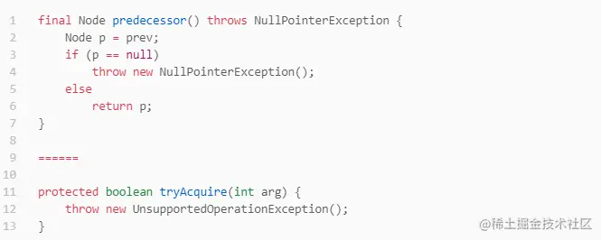 为什么说抛出异常那段代码永远不会执行到呢?方法predecessor是入队后执行的,AQS队列有这样的特点:入队后至少有两个节点,第一个节点永远是占有锁的线程对应的节点。