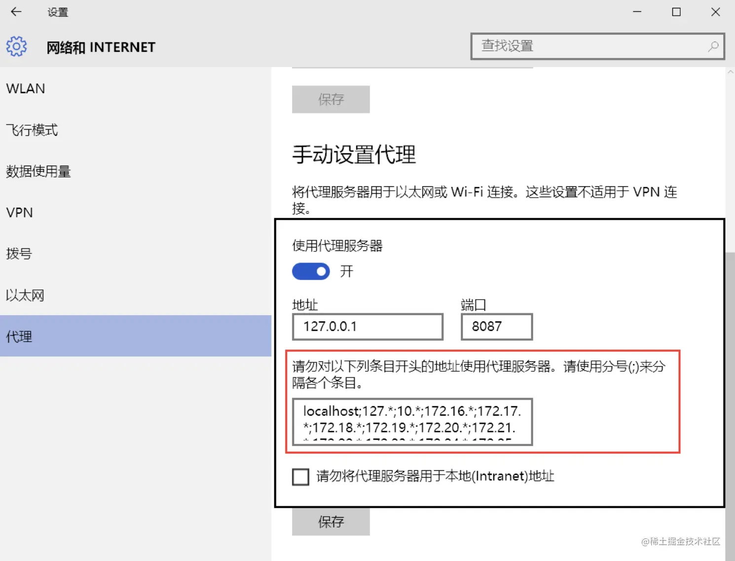 那能怎么办呢,百度了一下,没有相关的介绍,还是只有看错误提示了,再次注意到 proxy 这个词,好像,我们代理会用的这个词,既然不是网络本身的问题,那代理,代理,代理···对了,代理设置,发现问题的我急忙忙的跑到 设置->网络和INTERNET->代理,一看,吓我一跳: