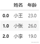 df = pd.DataFrame({'姓名':['小王','小张','小李'],'年龄':[23,26,19]})