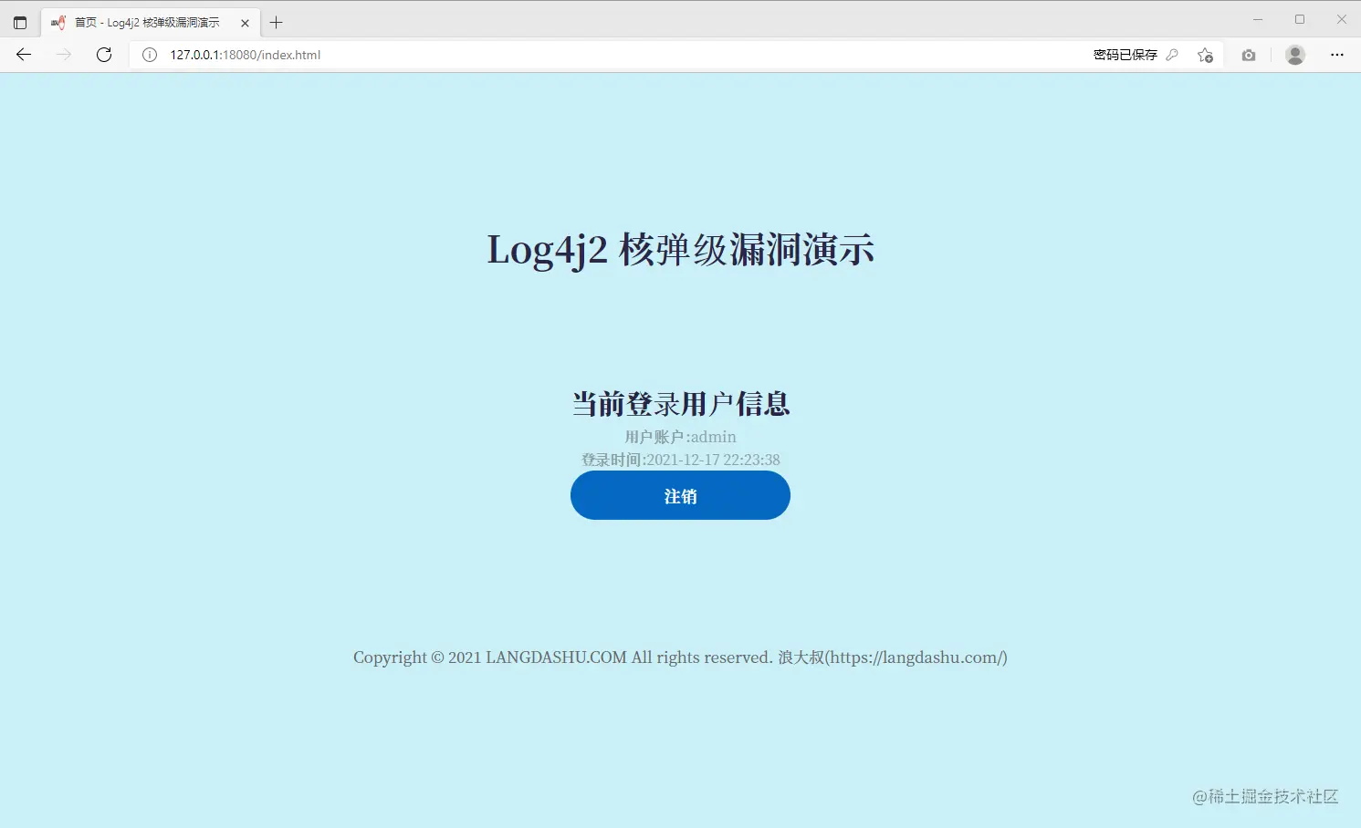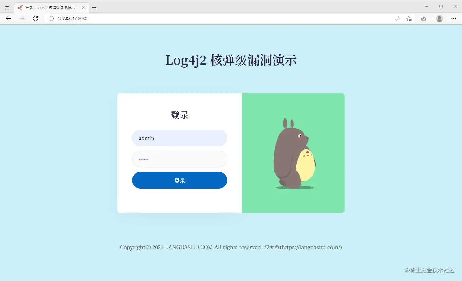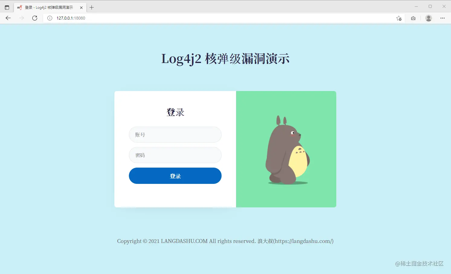 在浏览器访问被攻击引用,地址:http://127.0.0.1:18080/