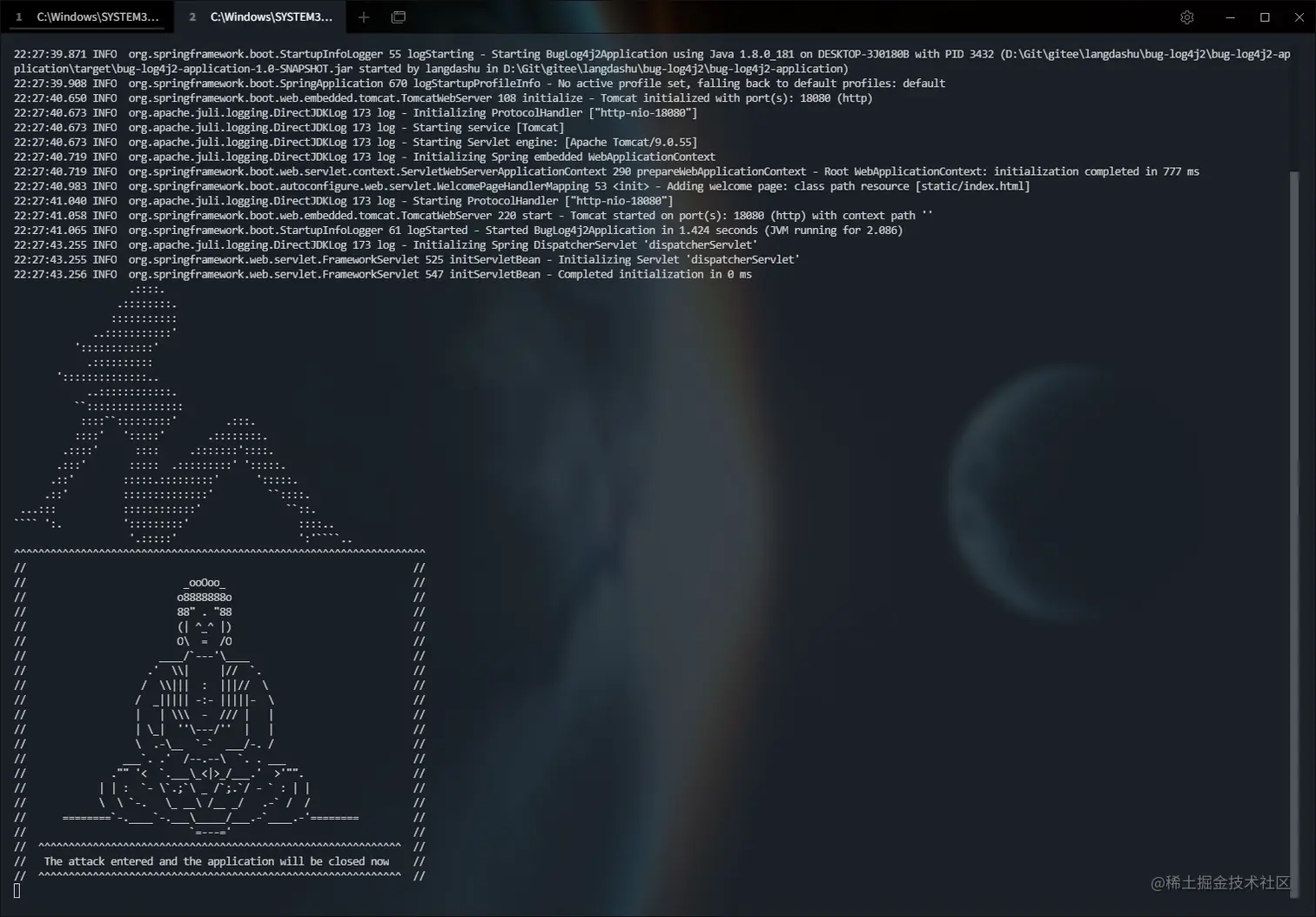 3.4 查看被攻击应用控制台,发现输出攻击者的恶意日志"大佛保平安"