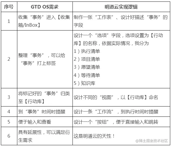 通过前文分析,我们的GTD OS至少需要以下功能,左侧是需求描述,右侧是明道云实现逻辑。