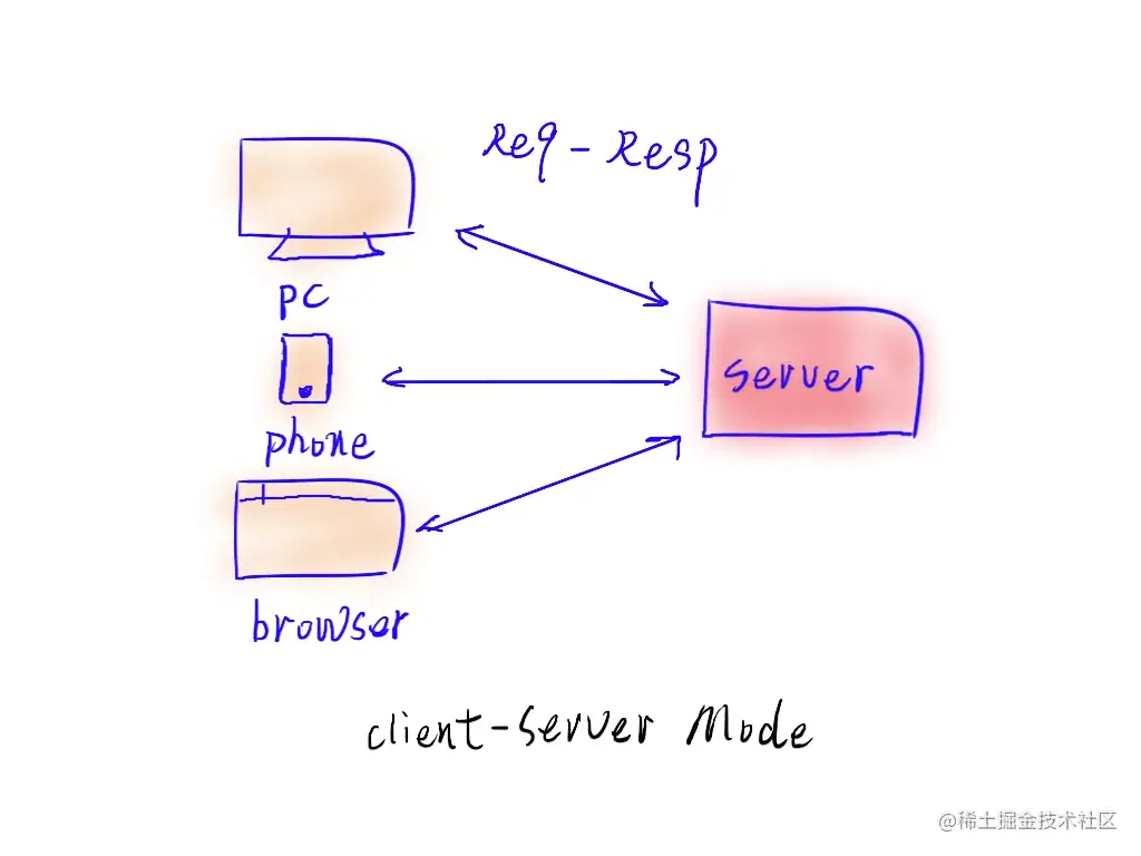有了互联网就有了 client-server 模式。client-server 模式以请求-响应方式工作,客户端发送请求信息,服务端接受请求,作出相应处理,然后发回响应信息。所有我们访问的互联网网站都是这种架构。在桌面程序流行的时代,互联网还没有当前这么发达的时代。Client-Server 还只代表 Desktop Client-Server 模式,使用浏览器的方式称之为 B-S 模式,即 Browser-Server 模式。如今 Browser、Desktop Application、Mobile Application、Mobile Web 等统称为 Client。