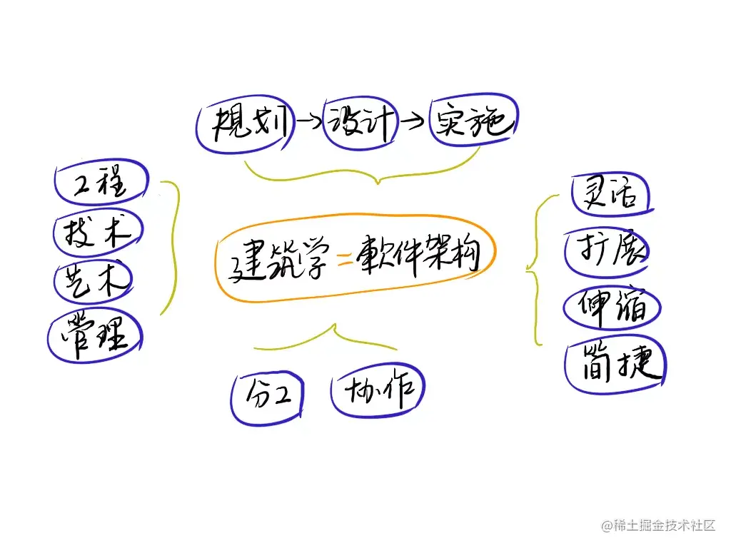 建筑学研究建筑的规划、设计和实施。软件架构研究软件的规划、设计和实施。