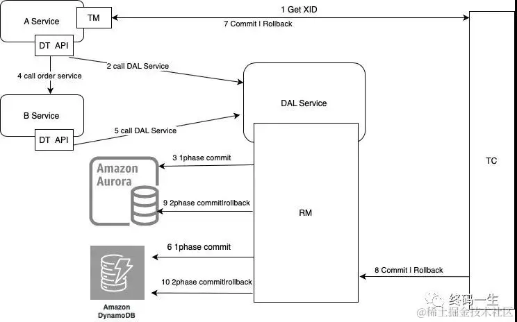 DynamoDB 本身没有分布式事务机制,DAL 结合 DynamoDB 功能属性,对提供的插入、更新、删除和查询接口,设计 2PC 机制 来满足 DynamoDB 的 事务属性。