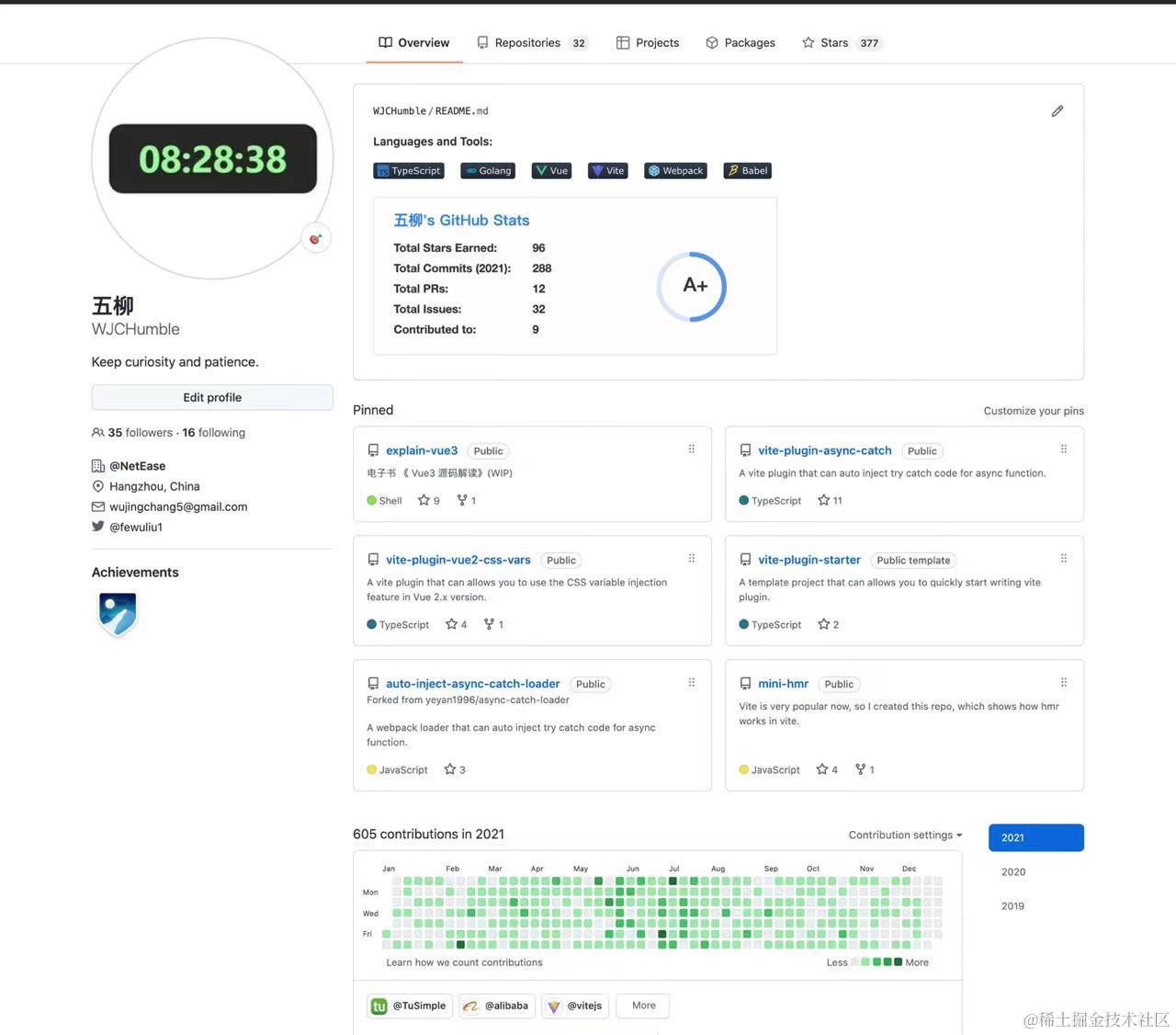 首先,在掘金上写了 16 篇文章,涵盖框架源码、工具、译文等。不过,输出的文章收到的反馈,在数据方面确实不是很好,我想这也是很多同学在技术写作的时候会感到困惑的一点。其实,我们也不需要太过纠结文章数据,从写作的角度,出发点是自己学到了什么,然后分享出去帮助需要的人,这样一来,那么数据只是额外带来的效益,重要性也就不那么强了(初心最重要)。