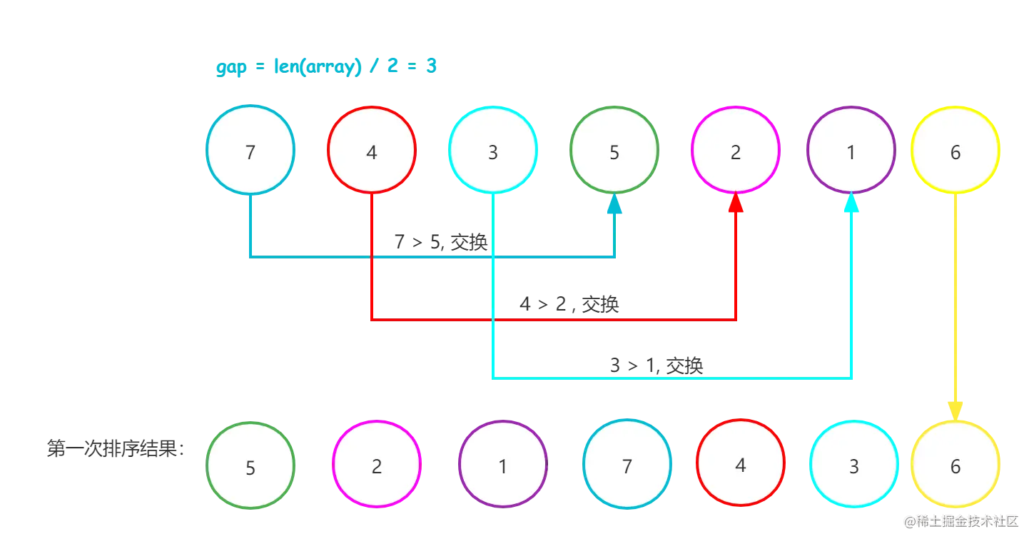 array[1...n] 中,增量序列为 {g1, g2, ..., gt} , n>g1>g2>...>gt=1 。 - 第一趟增量 g1, 所有间隔为 g1 的记录分在一组,对每组记录进行插入排序。