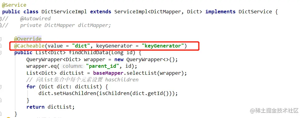 在 service 层对应的实现方法上增加注解@Cacheable(value = "dict", keyGenerator = "keyGenerator")