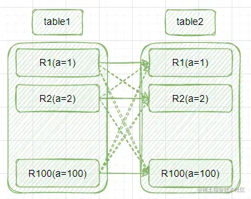 假设:table1有100行数据,table2有1000行数据。