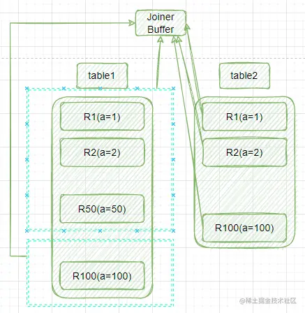 按照分块的方式,我们重新看下,假设table1的50条数据装满Joiner Buffer,再次看下执行流程吧: