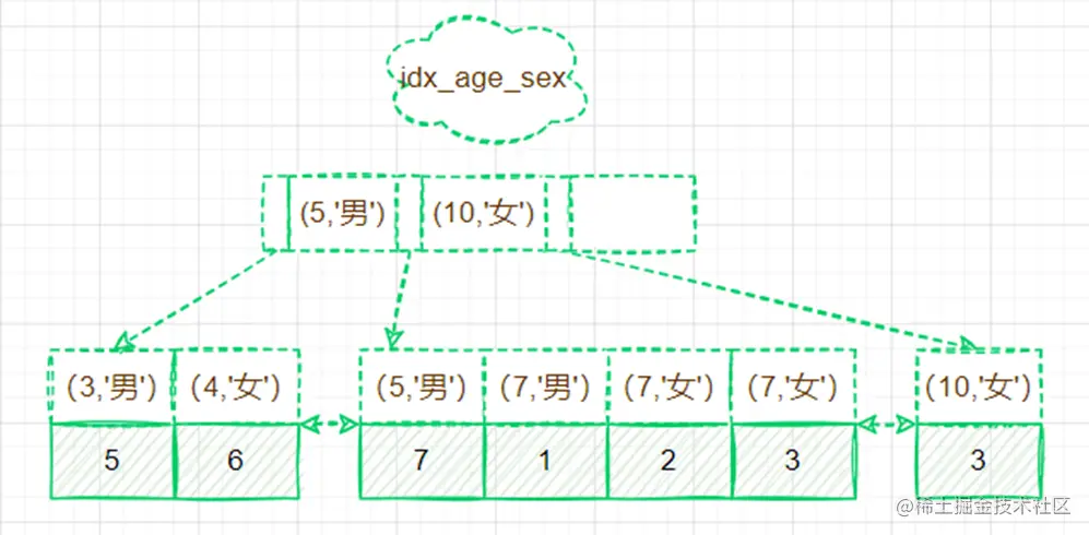 联合索引中(5,'男')代表一个索引键 ,5是年龄,'男'是性别。同样叶子节点的绿色阴影部分为Id值。