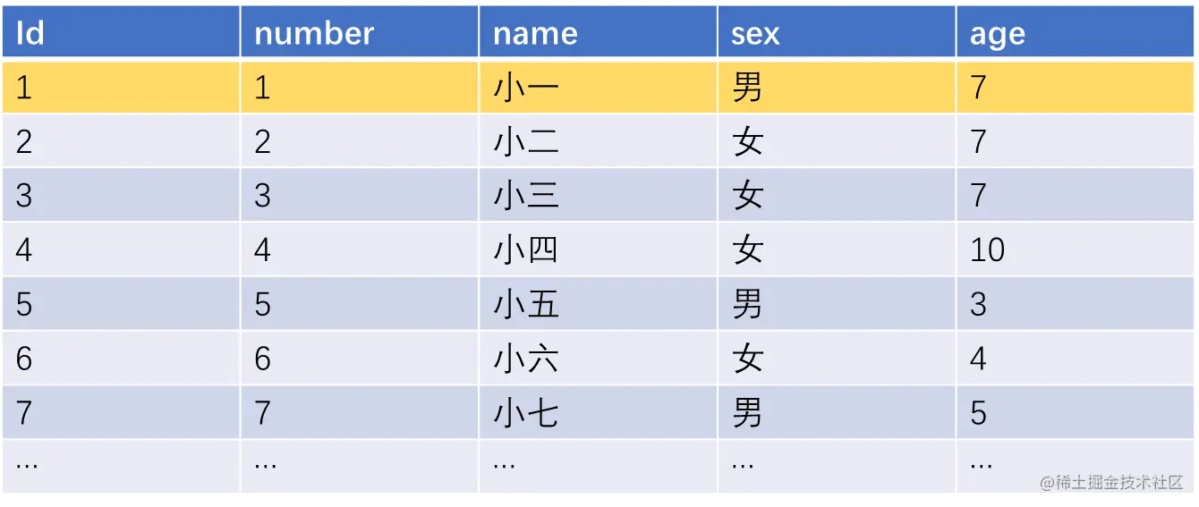 student表有很多数据,1~7条数据如上图所示,其中第一条黄色背景的数据,是如下SQL的命中结果: