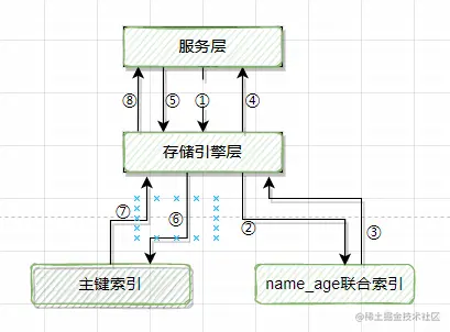 那这条SQL语句是如何执行的呢?前面我们给这个表加了4个非主键索引,既然我们用了两个查询条件,因此,为了提升检索性能,mysql的优化器会选择其中的一个索引树去查找。这里我们做一个假设,假设优化器选择idx_age这个索引,当然选择idx_sex这个索引,跟我们下面阐述的原理是一样的。