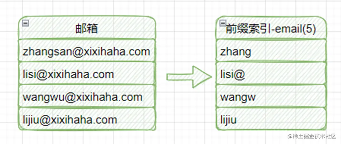 就像上图这样去设计索引,可以节省空间。但是要重点考虑选择前缀的大小,比如这个选择5、6还是7合适呢?你可以根据前缀的区分度来考虑。比如我们选择了email(1)这样的前缀,那么区分度只有26个英文字母,显然达不到索引设计预期的效果。