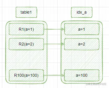 3.根据idx_a索引取出表t2中满足条件的行,跟R1组成一行,作为结果集的一部分;