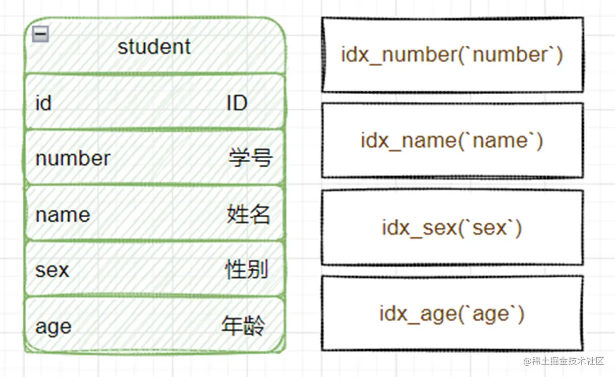 学生表,包含:id、number(学号)、name(姓名)、sex(性别)、age(年龄),并且id为主键,其他字段分别有一个单独索引。