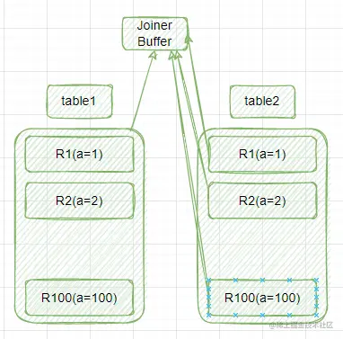 分块嵌套查询链接是针对简单嵌套查询的解决方案,采用Join Buffer缓存的方式,提升性能。执行过程是这样的: